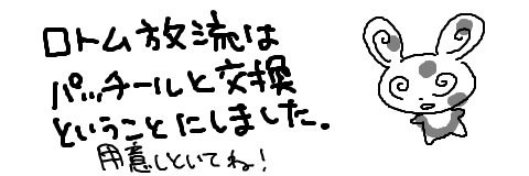 2010/02/09 手がきブログで読む>> 前の本編へ 一覧へ 次の話へ 次の本編へスキップ いろいろだらだらと。 孵化したロトムをGTSでパッチールと交換企画でした。 ここで話しているランキングは擬人化枠でまとめる予定です。 次の本編へスキップ 前の本編へ 一覧へ 次の話へ